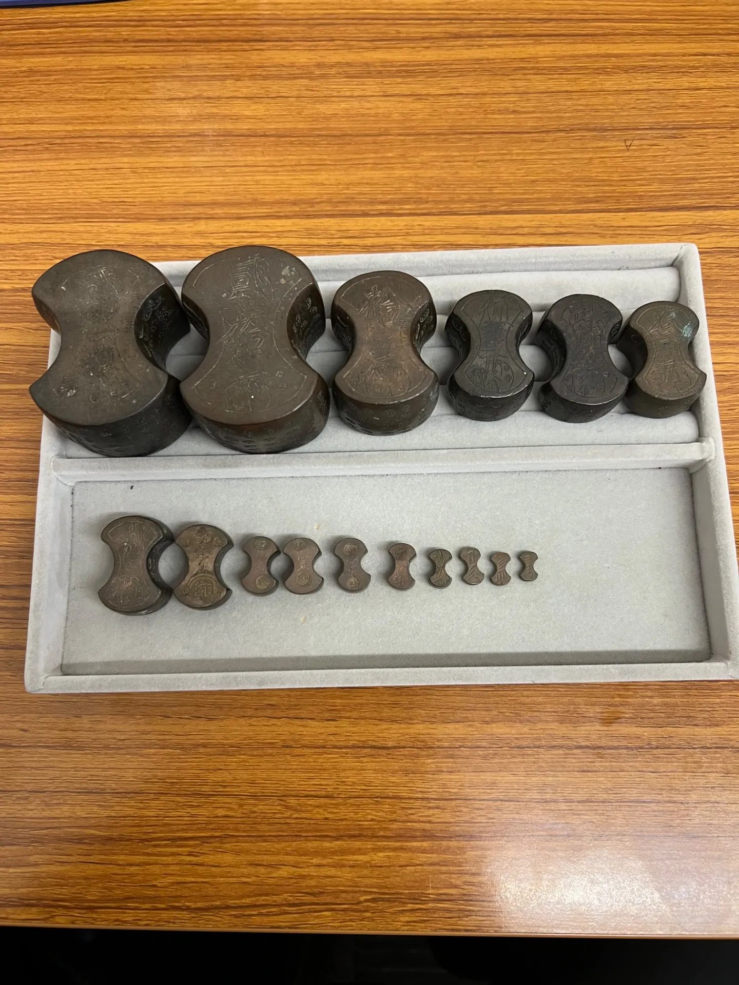後藤分銅は、江戸時代に金貨の計量に用いられた歴史あるお品物で、格式と風格を感じさせる逸品です。また、錫製の器は柔らかな光沢と手に馴染む質感が魅力で、長く大切に使われてきたことが伝わってまいりました。